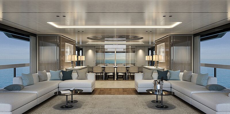 Транец и боковые панели в кормовой части яхты откидываются, радикально увеличивая площадь пляжного клуба. Можете загорать на свежем воздухе, а станет жарко — уйдете внутрь — на мягкие диваны и в кресла лаунж-зоны, отделанной деревом и мрамором.