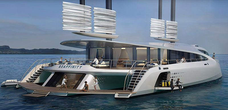 Тримаран Seaffinity очень экологичен: в движение его приводят паруса или гибридный двигатель — электричество вырабатывается водородными топливными элементами. Кроме того, этот алюминиевый многокорпусник длиной 45 м, шириной 16,8 м и с осадкой 2 м будет оснащен парой крыльев Oceanwings, призванных улучшить его ходовые качества. В экстерьере судна угадывается силуэт парящей чайки. Автор проекта яхтенный и автомобильный дизайнер Патрик Ле Кеман (VPLP Design) не скрывает свой источник вдохновения и подчеркивает гармоничные отношения концепта с окружающей средой.