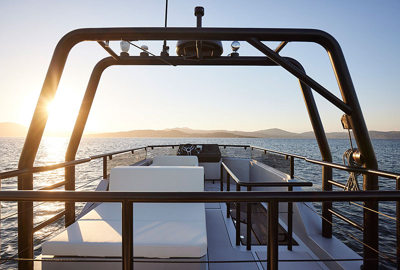 Много места для отдыха предусмотрено на флайбридже с верхним постом управления и солнечными батареями. Планировка полностью кастомизируется. Логично поставить лежаки для загара и превратить это открытое пространство в солярий.