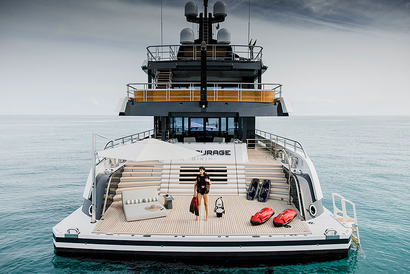 В базовом проекте Amels 60 Эспен Эйно сделал акцент на пляжном клубе с очень широкой купальной платформой. В пляжном клубе есть сауна, зона отдыха и еще один тренажерный зал. Сюда открыт прямой доступ из кают — достаточно пройти по коридору.