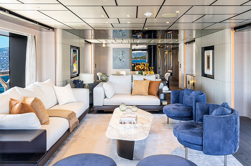Главной особенностью Riva 130‘ является большой салон на главной палубе: с панорамным обзором на 270 градусов и потолками высотой более двух метров. Внутренняя лестница с мраморными ступенями соединяет все палубы судна.