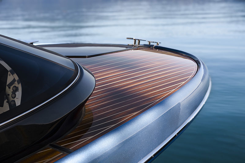 И действительно, с первого взгляда видны те стилистические приемы, которые делали Riva объектом желания для бомонда начиная с 1950-х годов, такие как покрытое многочисленными слоями лака красное дерево носовой части, палубы и кормовой платформы, детали из нержавеющей стали. С другой стороны, кокпит и пост управления получили новый дизайн, а первый корпус окрашен в нетипичный для Riva так называемый калифорнийский оттенок небесно-голубого, на фоне которого особенно аристократично смотрится аквамариновая ватерлиния.