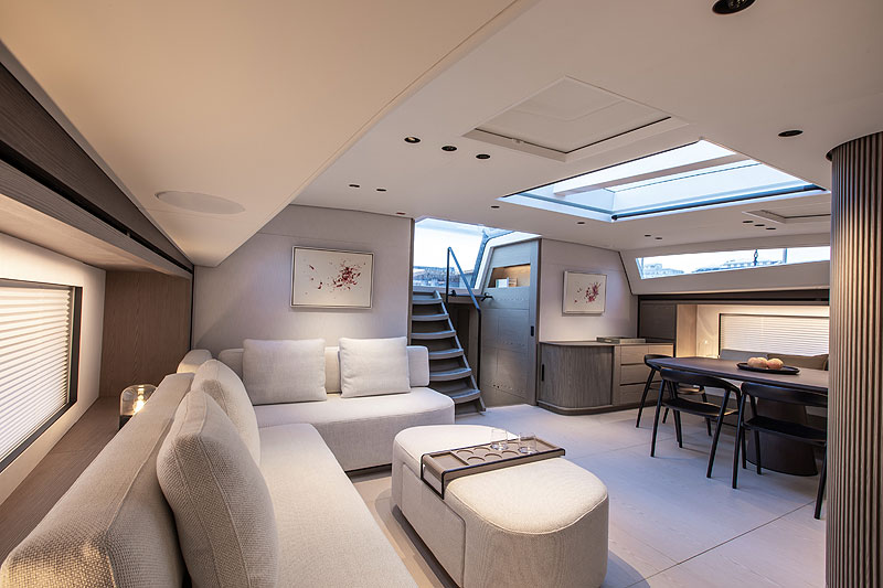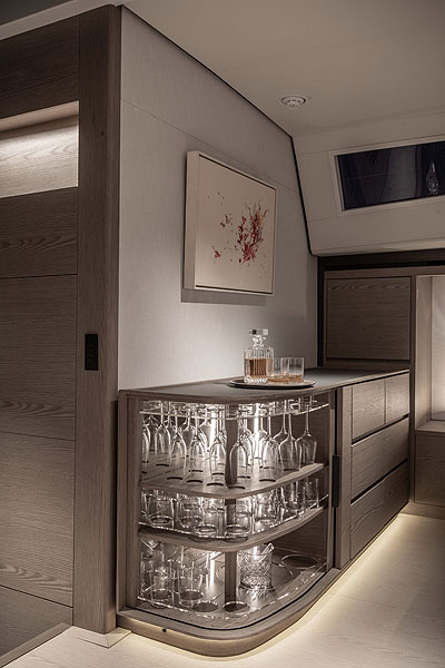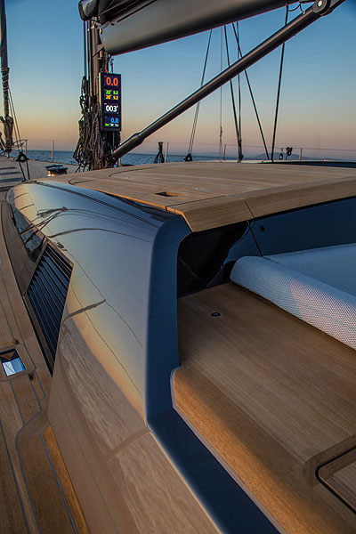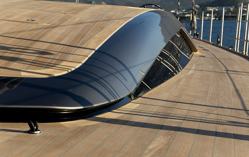 Палубную планировку и конфигурацию надстройки тоже можно выбирать. Заказчик Gelliceaux предпочел рубку Gran Turismo, причем дизайн был изменен согласно его пожеланиям: по бокам появились клиновидные иллюминаторы, по центру крыши сделана широкая полоса остекления, чтобы визуально контролировать мачту и добавить естественного света в салон. Другие разновидности надстройки — Raised Saloon и Deck Saloon. Есть опции и для транца. У Gelliceaux откинутая створка превращается в купальную платформу, одновременно открывая доступ в гараж для 5-метрового тендера. В версии magic transom эта платформа имеет дополнительные раскладные секции, то есть пляжный клуб становится еще больше — там даже можно поставить обеденный стол.