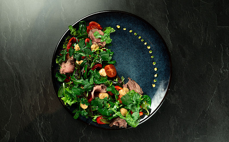 Шеф-повар Евгений Регер активно использует в своих блюдах локальные продукты: форель с фермерского хозяйства и черноморские морепродукты, кавказские сыры, фрукты и овощи с местных хозяйств. Каждый сезон в ресторане предлагают специальное меню. Так, начиная с октября шеф готовит блюда с хурмой, сочинской фейхоа и абхазскими мандаринами, а мясо и рыбу виртуозно коптят в собственной коптильне. Впечатляет выбор крепких напитков и более 50 коктейлей: классические и авторские — на любой оригинальный вкус. Профессиональные миксологи постоянно обновляют коктейльную карту, создавая вкусные шедевры с сезонными южными фруктами, ягодами и горными травами.