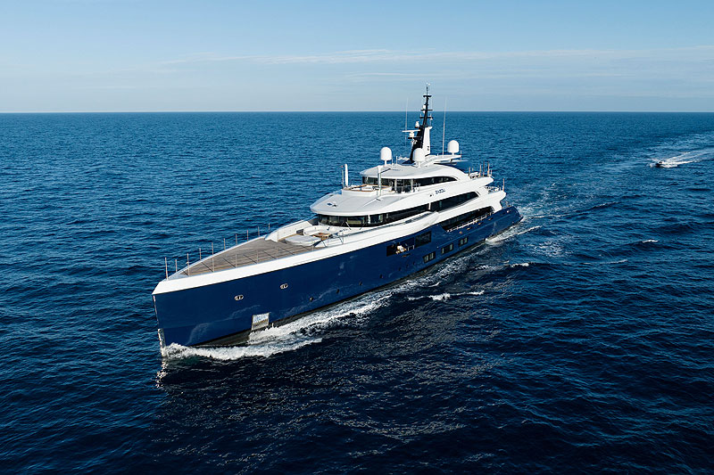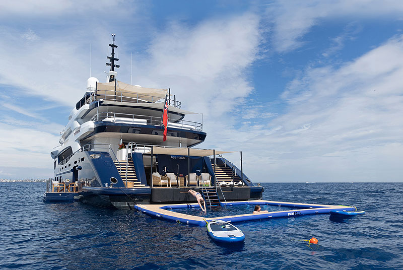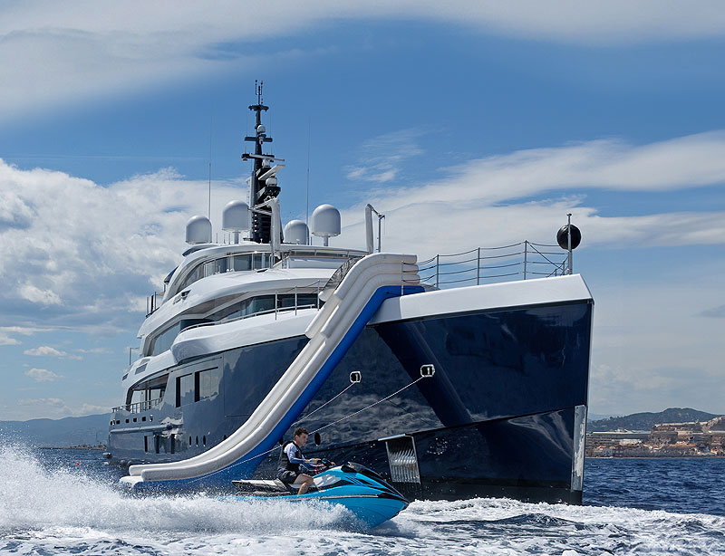 Поверхность второй палубы продолжается до самого форштевня, благодаря чему здесь удалось разместить вертолетную площадку touch-and-go, а также заметно увеличить валовую вместимость яхты (1180 GT). Высокий надводный борт дает ей еще одно преимущество: при постановке на якорь на нем крепят надувную водную горку, так что гости Zazou получают в свое распоряжение целый домашний аквапарк — горку дополняет швартуемый у кормы надувной бассейн и полный гараж водных игрушек.
