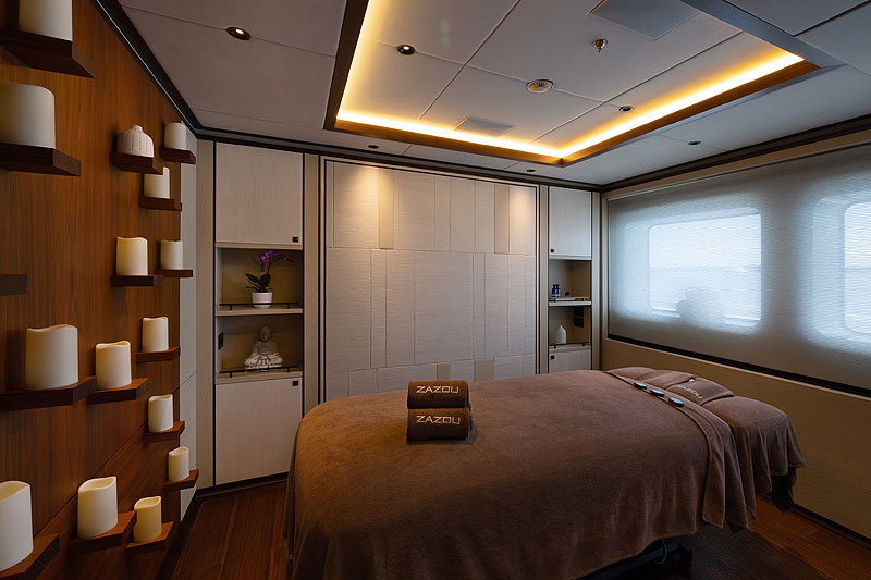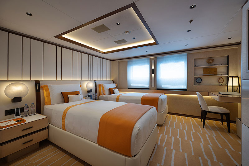 Для гостей устроены четыре суита на нижней палубе. В одном двуспальная кровать разделяется на две отдельных. Таким образом, пассажирских кают на яхте пять, а шестая добавляется при переоборудовании массажного кабинета наверху.