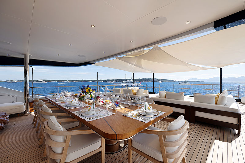 Важным достоинством проекта верфь считает самый крупный для судна такого размера сандек. Благодаря искусному архитектурному приему верхняя палуба Zazou в боковой проекции не выглядит такой уж большой: кажется, она заканчивается там же, где лобовое остекление надстройки. Однако перед стеклом есть еще и бассейн, который мастерски вписан в изгиб крыши нижнего этажа и не сразу бросается в глаза. То есть фактическая длина сандека, начиная с передней кромки бассейна и заканчивая кормовым релингом, составляет 36 м, а общая площадь — 200 кв. м!