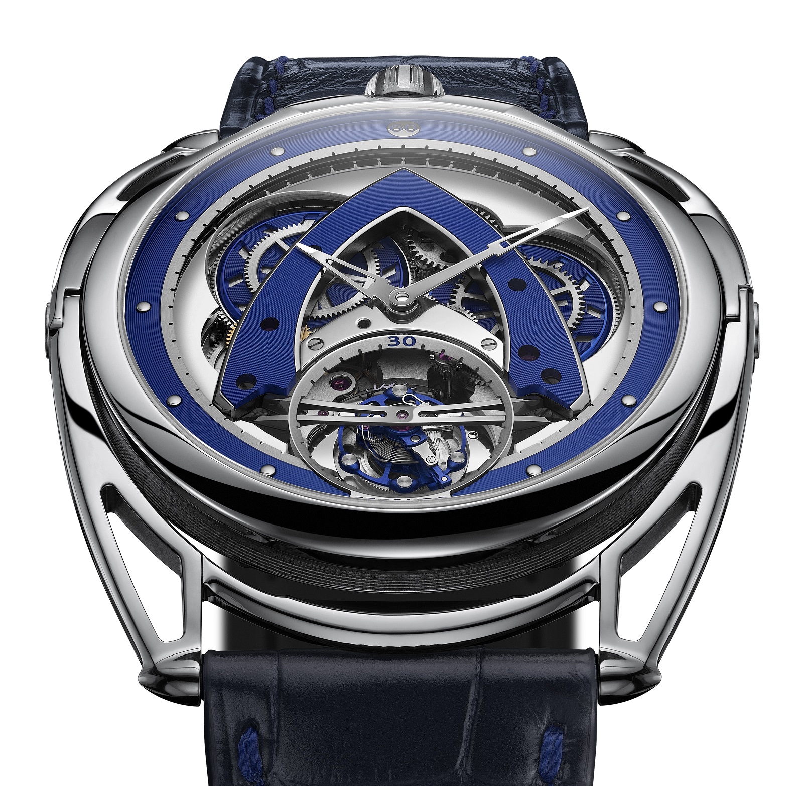 Модель DB28XP Steel Wheels Tourbillon комплектуется синим ремешком из кожи аллигатора и текстильным браслетом.