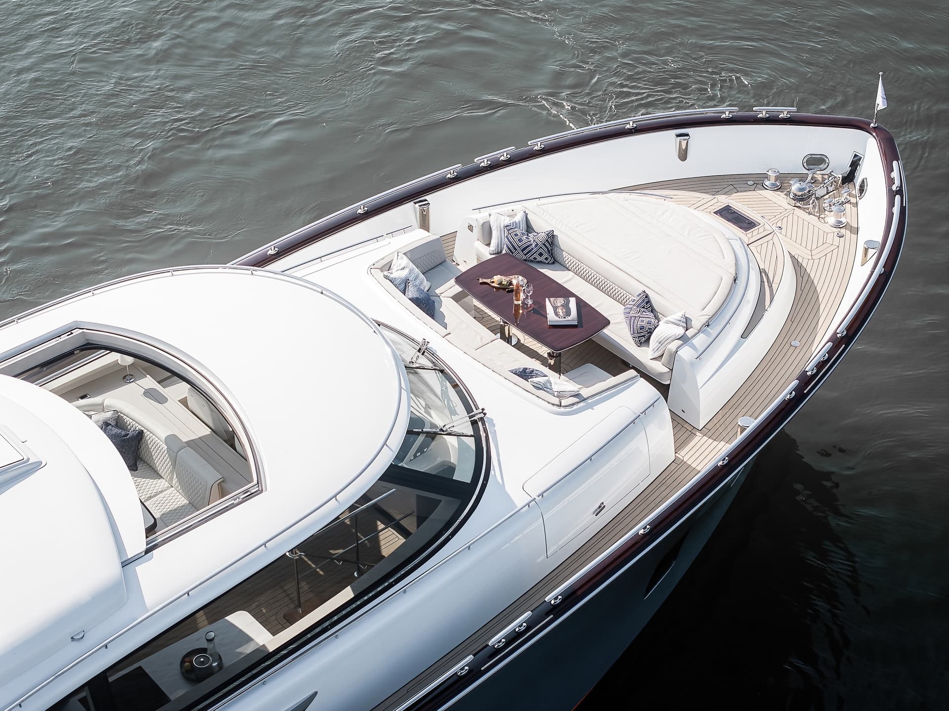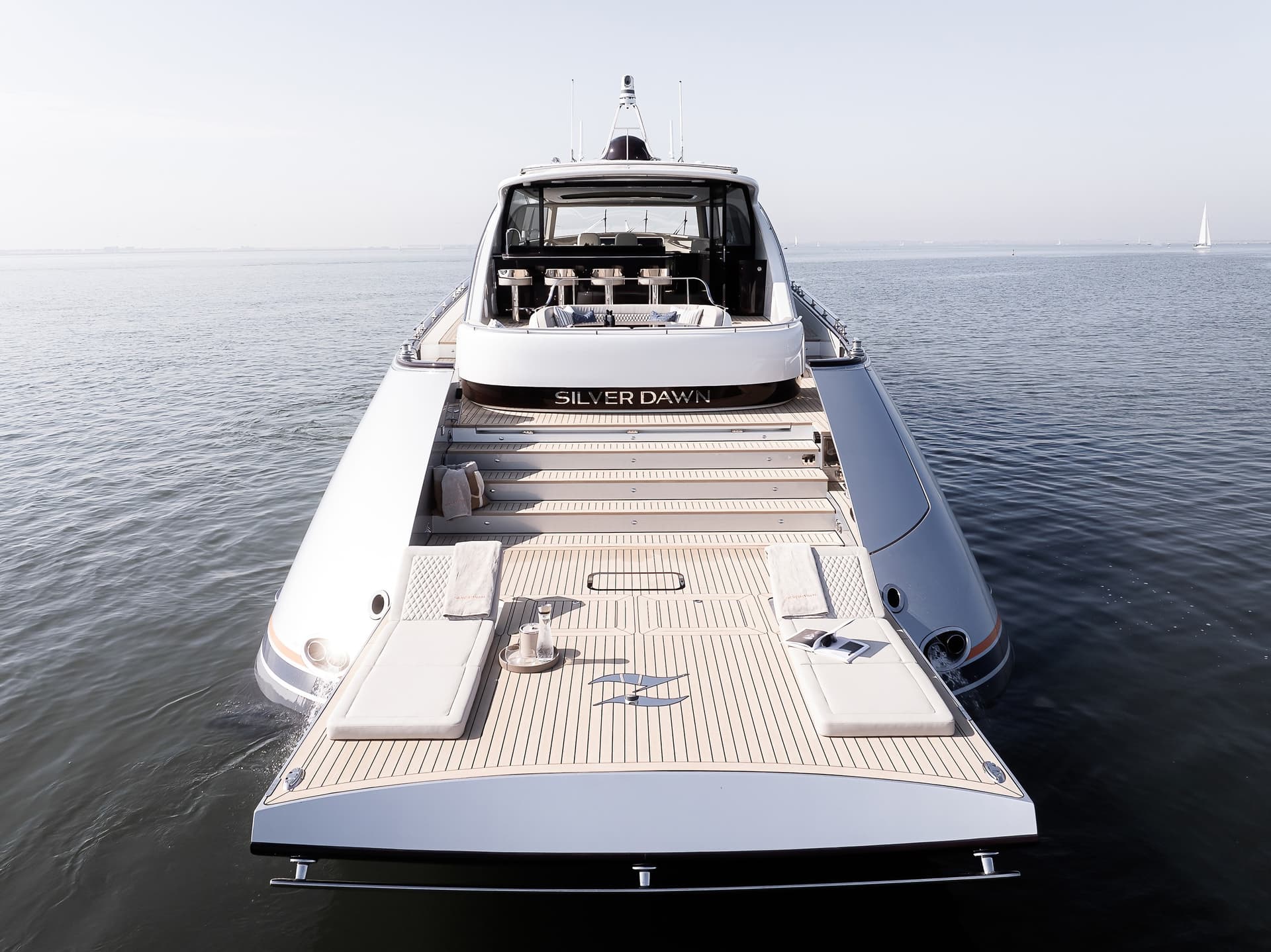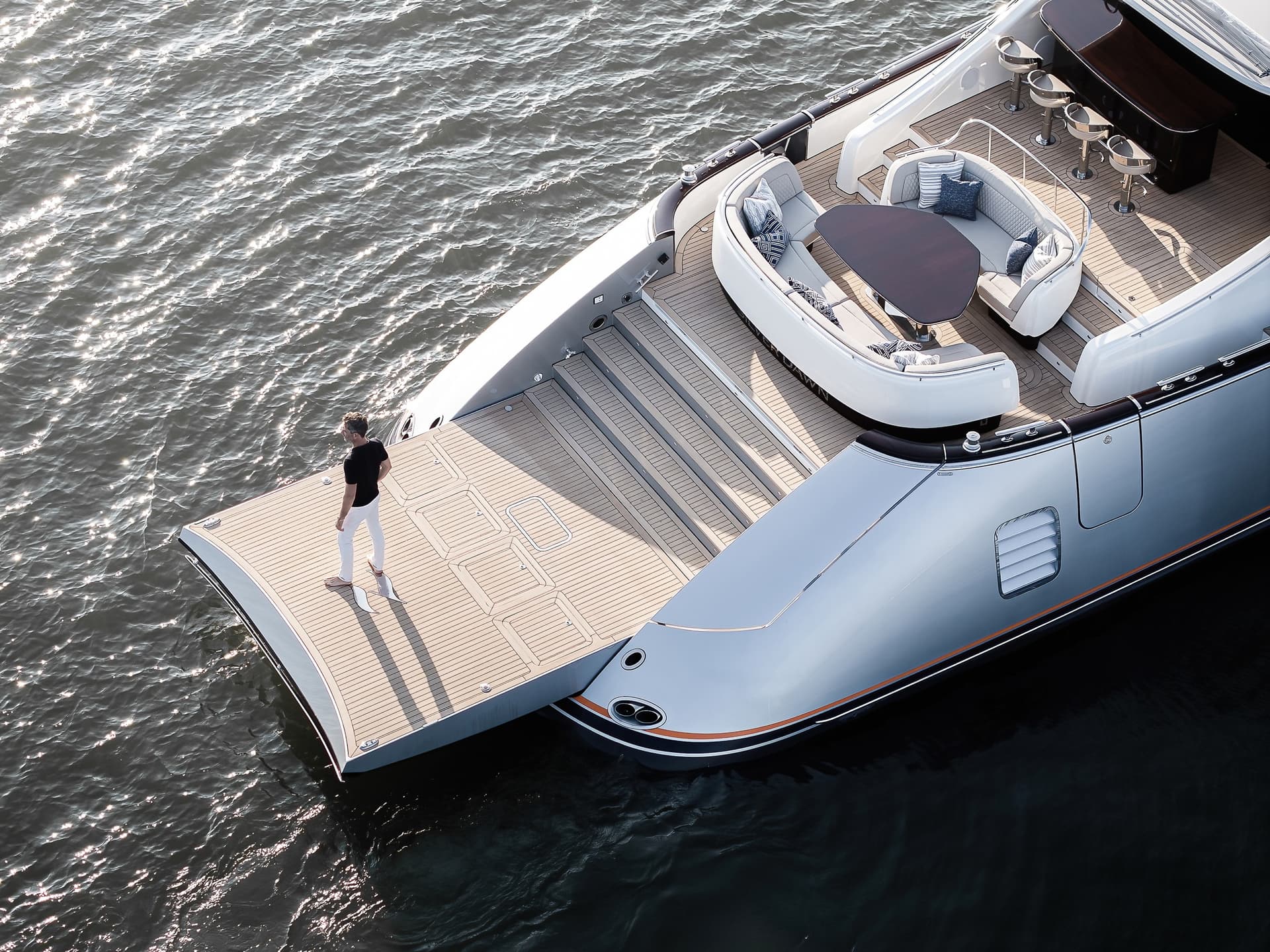 Закругленная обтекаемая корма вызывает ассоциации с классическими спорткарами вроде Porsche 356. Более того, первый корпус, Silver Dawn, еще и окрашен в фирменный серебристый оттенок Porsche Rhodium Silver с оранжевой окантовкой вдоль ватерлинии. Откидывающаяся купальная платформа представляет собой почти квадратный помост, обшитый тиком, к которому в качестве опции может быть добавлен гидравлический трап. На палубу с платформы ведут широкие ступени. На корме установлены диванная группа и стол. Приятная деталь: дверцы в фальшборте для высадки на берег при швартовке лагом предусмотрены с обеих сторон судна. Под свесом крыши расположена барная стойка с четырьмя высокими сиденьями. От салона ее отделяет изогнутое стекло, уезжающее внутрь панели.