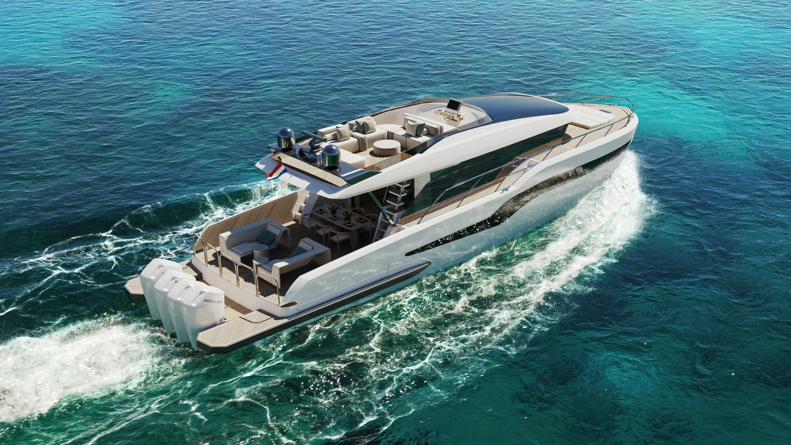 Яхта оснащена четырьмя подвесными двигателями Mercury V12 Verado, которые обеспечивают максимальную скорость до 40 узлов. Малое водоизмещение позволяет использовать яхту в мелководных и труднодоступных районах. Корпус еще строится, поэтому будущий владелец сможет выбрать различные варианты внешнего оформления судна.