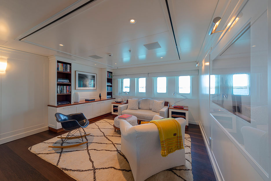 Для работы над интерьерами пригласили самого Филиппа Старка. Его фирменный стиль преобразил яхту, наполнив ее неповторимой атмосферой. Просторный главный салон с белыми стенами и глянцевым потолком утопает в солнечном свете, льющемся сквозь окна высотой от пола до потолка. Взгляд радуют яркие акценты, вставки рыжевато-коричневого дерева с тщательно подобранной текстурой «елочкой» и приятных на ощупь материалов.