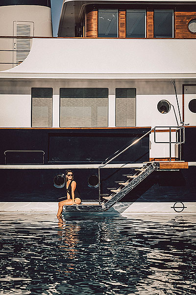 Через отдельный выход можно попасть на носовую часть палубы. Она свободна и может служить как солярием (экипаж принесет раскладные шезлонги), так и местом хранения водных игрушек, для загрузки которых установлен кран. В набор спортивного инвентаря входят электрофойлы, вейкборды, водные лыжи, буксировщики Seabob, оборудование для дайвинга и снорклинга. В качестве разъездного катера используется 10-метровый Novamarine Chase Tender. А главная изюминка водных развлечений — плавучий бассейн, который монтируется у левого борта.