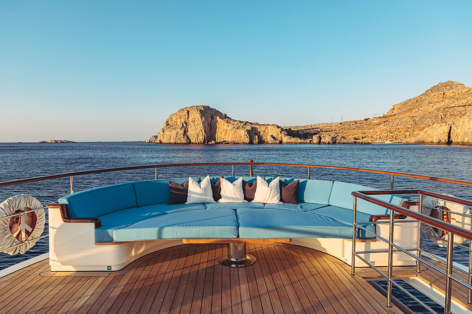 На верхней палубе расположены навигационная рубка, небольшой скайлаунж с функцией кинотеатра и открытая зона отдыха. Выкрашенная в яркий желтый цвет дымовая труба смотрится здесь как арт-объект. Над столом на 10 персон, предназначенным для обеда на свежем воздухе, можно установить легкий тент на штангах, а шезлонги и диван в виде полумесяца остаются на солнце — там удобней всего загорать.