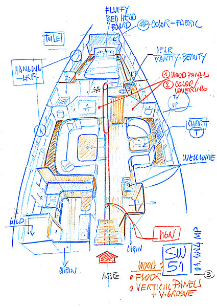 Мастер-каюта с отдельным санузлом занимает носовую часть яхты, а две гостевые находятся ближе к корме. Одна из них, правая, предлагается в конфигурации twin, и соседствует с гостевым санузлом. Все пространство каюты по левому борту можно заполнить двуспальной кроватью либо установить двухъярусные койки, и тогда там поместится внушительный шкаф-кладовая. В форпике также можно оборудовать компактную каюту для экипажа.