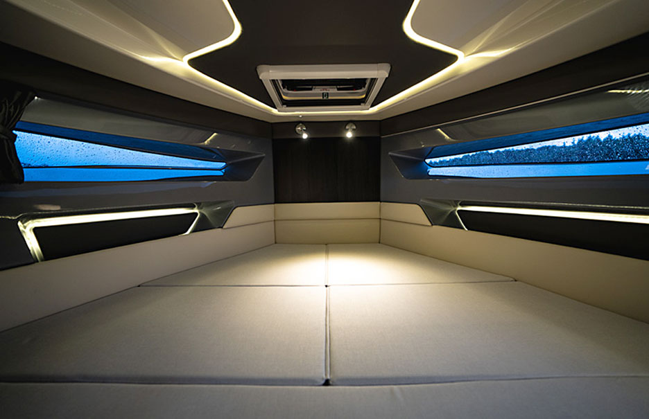 В правой части панели управления сделан проем двери в каюту в носу. Внутри поместились широкая двуспальная кровать и небольшой, но удобный санузел с душем, умывальником и туалетом. В ней светло благодаря люку и двум окнам шириной во всю стену. Вечерами можно включить красивую LED-подсветку по стенам и потолку.