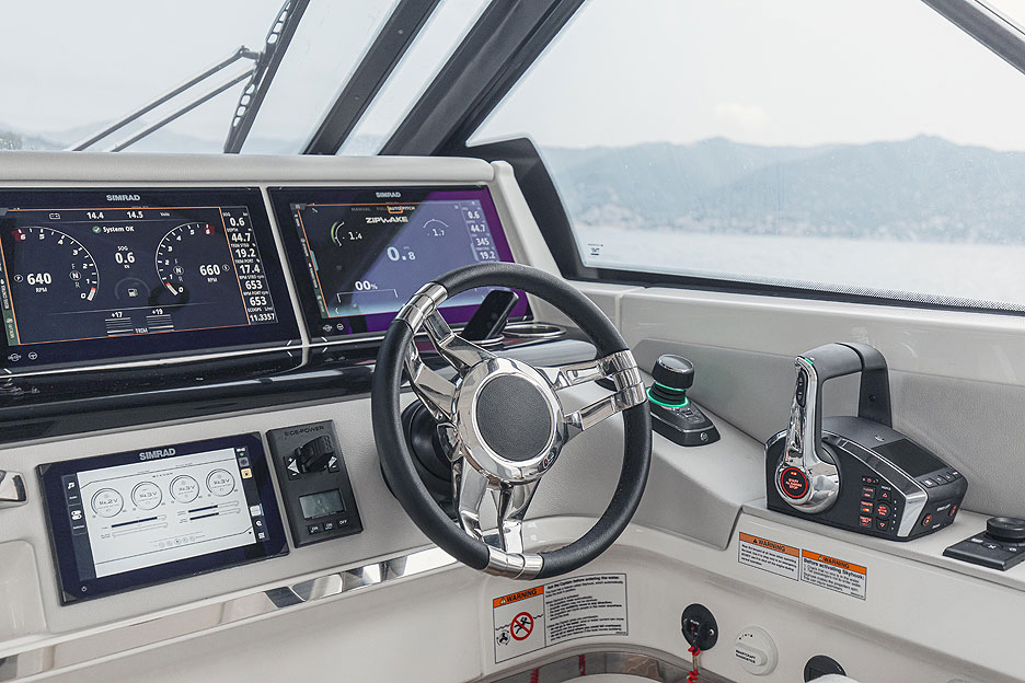 В стандартной комплектации катер оснащен самыми передовыми в отрасли технологиями и оборудованием от Simrad. Электроникой управляет новейшая версия операционной системы C-Zone. Компактный пост управления включает в себя два 12-дюймовых дисплея, эргономичный штурвал, носовое подруливающее устройство. Опционально можно заказать джойстик для подвесных моторов Mercury.