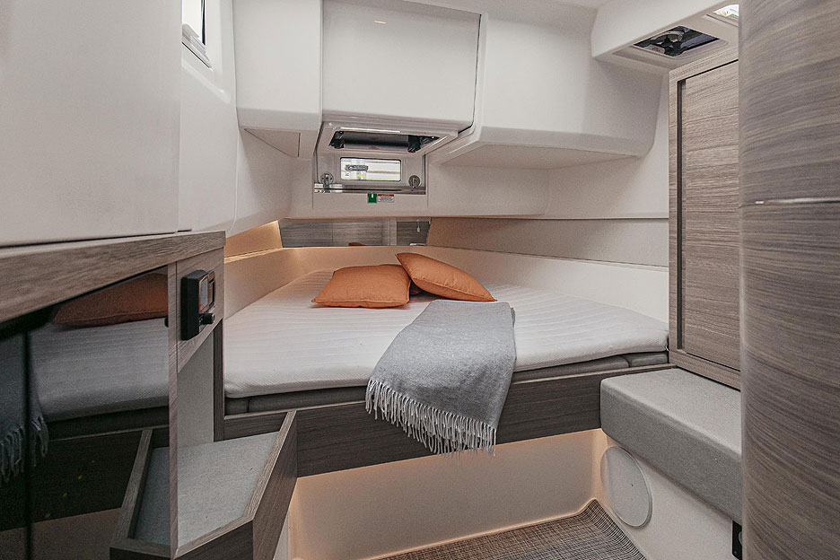 Главная каюта занимает носовую часть судна. В ней подкупает немаленькая высота потолка — 1,83 м и то, насколько она светлая. Над треугольной кроватью проделан большой аварийный люк, который в открытом положении обеспечивает легкий доступ в передний кокпит и возможность быстро спустить багаж в каюту. Под лестницей размещено еще одно спальное место. Просторный санузел включает в себя электрический туалет и душ.