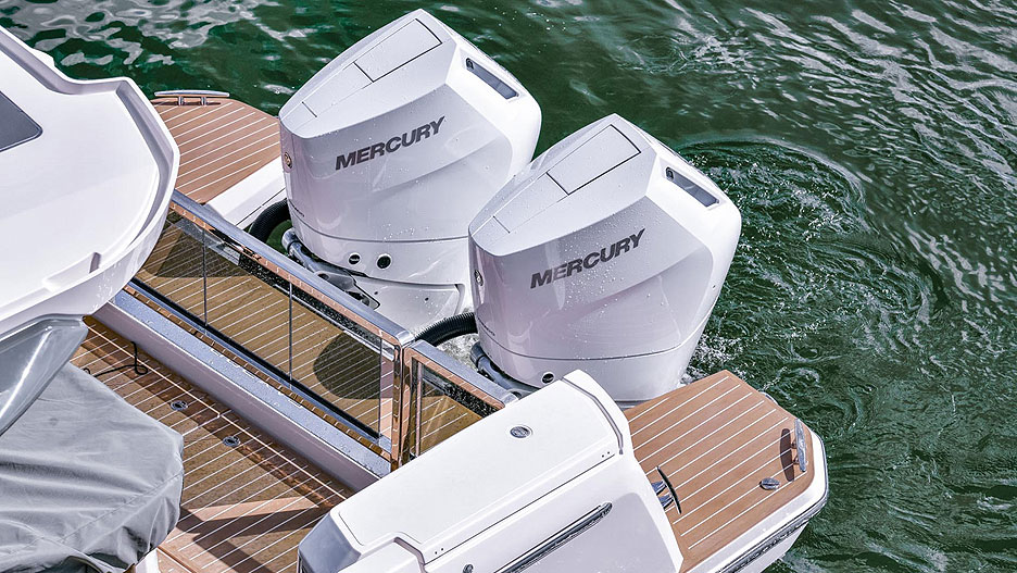Двигатели, разумеется, от Mercury (бренд также принадлежит Brunswick). По желанию заказчика можно поставить один 300-сильный Verado V8, 400-сильный V10, пару 225-сильных V6 или два V8 мощностью 250 или 300 л. с.