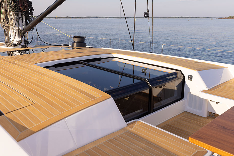 Надстройка немного возвышается над уровнем палубы. Люк-атриум с раздвижными дверями, которые открываются по нажатию кнопки, хорошо освещает салон естественным светом.