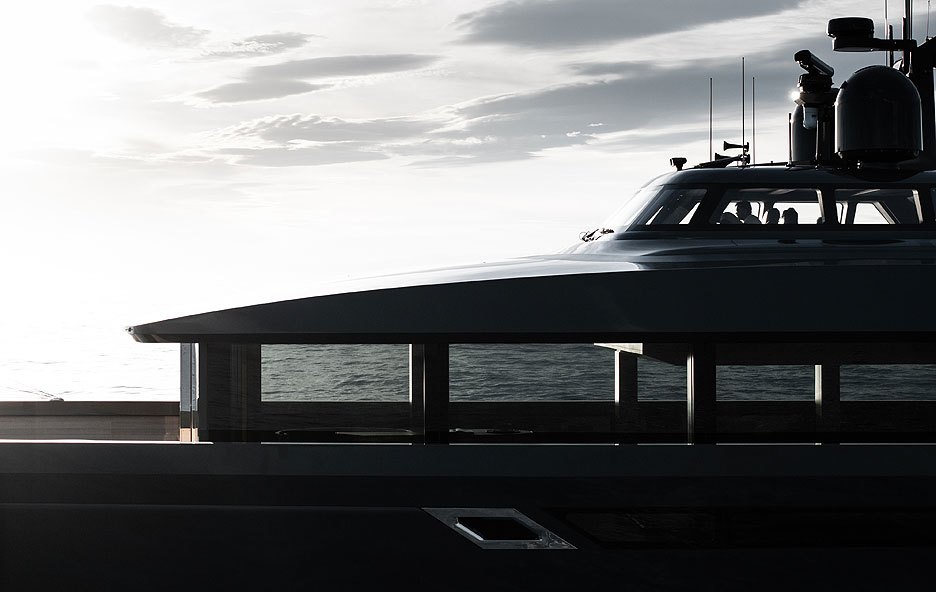 Благодаря строгим длинным линиям, невысокой спортивной надстройке с черным остеклением и вертикальному форштевню, который на фоне общего темно-серого окраса особенно ярко сияет зеркальной металлической обивкой, яхта смотрится не просто брутально, но даже подчеркнуто агрессивно. Однако при длине 45 и ширине 8,9 м массивной она не кажется: все дело в пропорциях, которые напоминают скоростной катер.