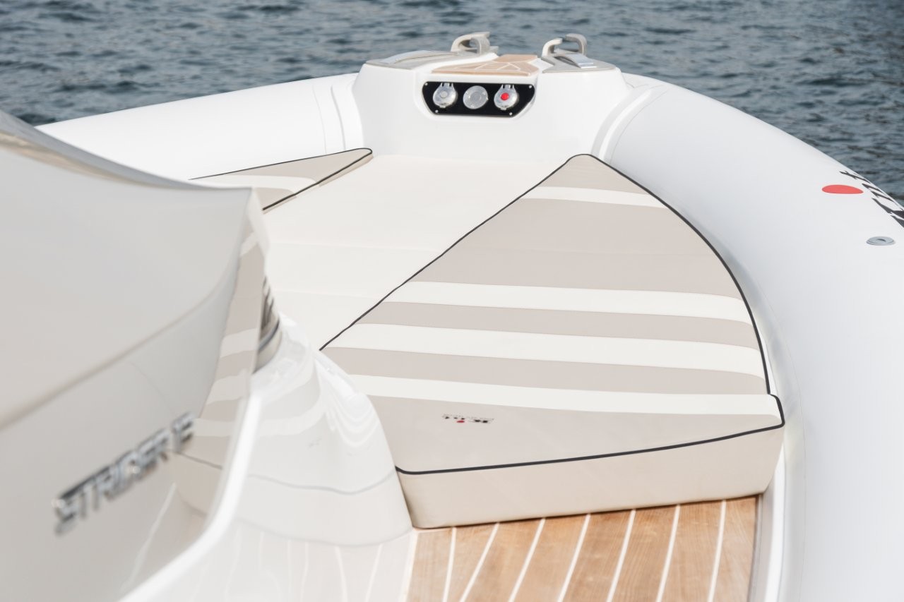 Длина лодки составляет 13,5 метров, а ее мощь обеспечивается тремя двигателями Mercury Verado V10, каждый из которых развивает 400 лошадиных сил. Этот макси-RIB разработан под руководством всемирно известного яхтенного дизайнера Кристиана Гранде.