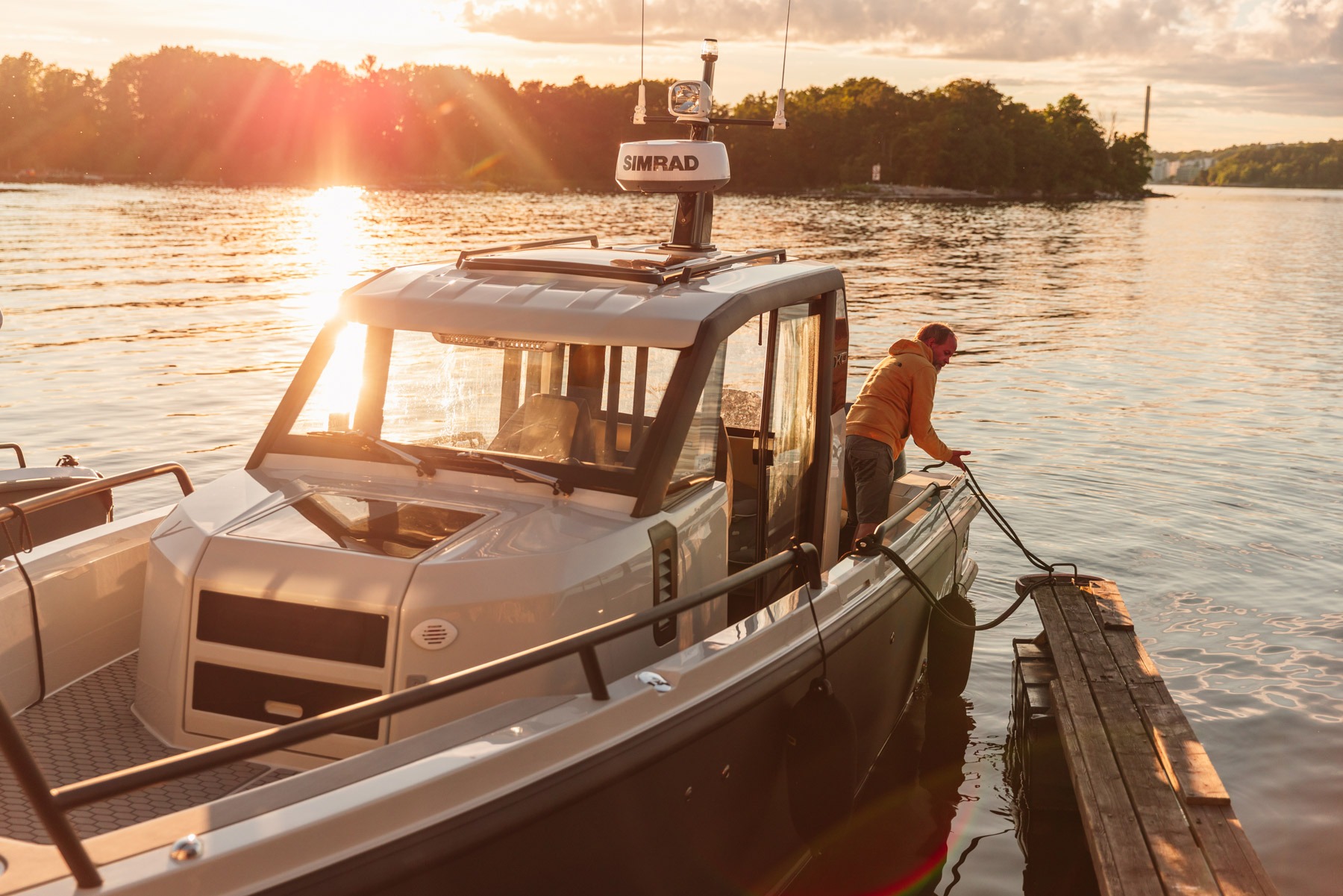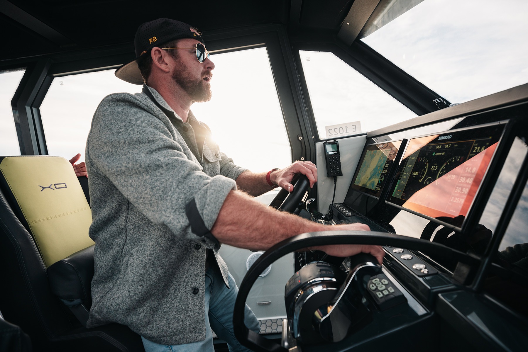 Благодаря максимальной площади остекления и большому пространству над головой кабина оставляет необычное ощущение — вы будто бы не на лодке, а в кабине фуникулера на фешенебельном горнолыжном курорте или в каком-то концептуальном транспортном средстве из будущего. Крыша рубки может быть оборудована сдвижным люком, а также релингами для крепления дополнительного оборудования или багажа в дальних походах. Также здесь можно установить крепление для буксировочного фала, чтобы таскать водные игрушки или вейкбордиста. Радарная мачта с прожектором, управляемым из кабины, может складываться для прохода под низкими мостами и для уменьшения габарита при перевозке катера.
