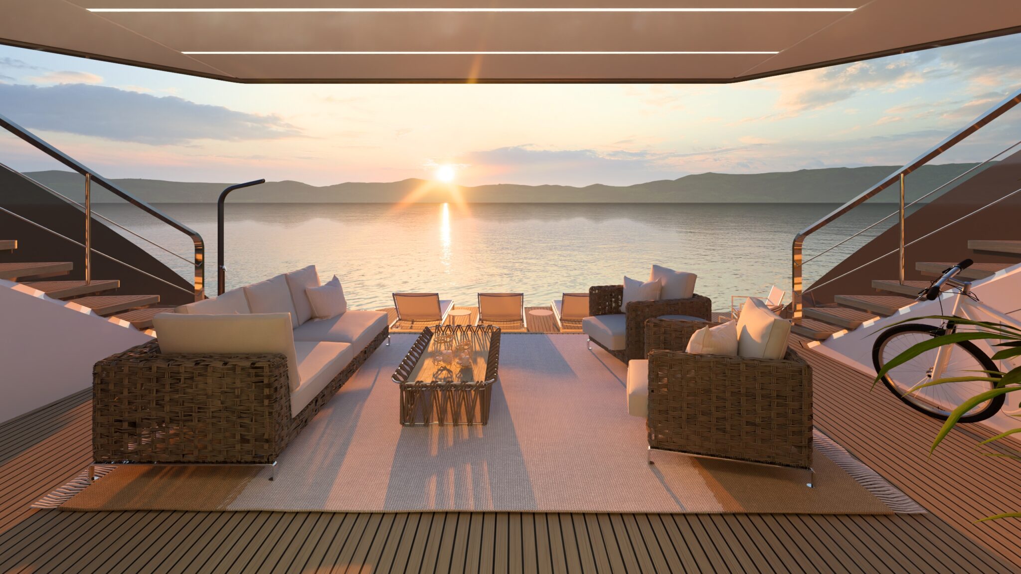 При этом ключевым элементом проекта в любом случае останется огромный пляжный клуб, который верфь описывает как «не похожий ни на что в своем классе». Он объединяет лаундж, бар и многофункциональную велнес-зону в единое пространство для отдыха. В кормовой «студии» можно оборудовать тренажерный зал, массажный кабинет или комнату для занятий йогой. Из нее имеется прямой доступ к сауне или хаммаму, купели с холодной водой, душу и дневному санузлу. Размеры купальной платформы достаточно велики, чтобы размещать там и шезлонги с зонтиками, и водные игрушки. Более того, площадь пляжного клуба становится еще больше за счет раскрывающихся на три стороны платформ.
