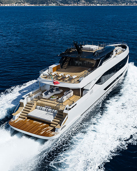 При первом взгляде на яхту с профилем в виде секиры, удлиненной носовой частью и сдвинутой к корме приплюснутой надстройкой возникает цепочка ассоциаций: «мощь», «несгибаемый характер», «нет преград». Уж точно не скорость. Но в случае Angiola все сложнее. У нее силовая установка с очень впечатляющим числом лошадиных сил, да еще и с водометами — как у скоростных AB от Next Yacht Group.