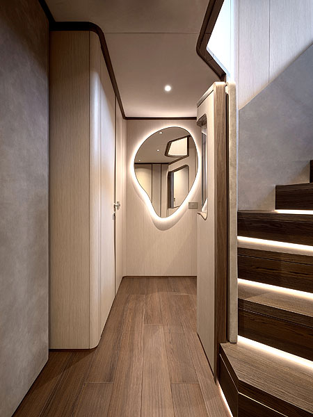 Нижняя палуба, предназначенная для гостей и экипажа, спроектирована с акцентом на комфорт, функциональность и эффективность. Просторные и залитые естественным светом гостевые помещения включают два VIP-люкса и две симметричные двухместные каюты.
