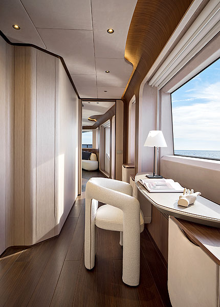 И, наконец, спальня. В ней понимаешь, зачем нужен вертикальный форштевень. Три стены этого светлого помещения занимают широкие окна. Высокая кровать, ориентированная по ходу движения, придвинута изголовьем к задней стене с овальным окном. Хозяин Angiola будет встречать утро, любуясь морской далью, озаренной солнцем. В каюте, расположенной не в надстройке, а под верхней палубой, обзор в 270°! Более того, из мастер-каюты есть выход на треугольную площадку у форштевня. В бортах проделаны отверстия. Вместо потолка — та самая сетка, натянутая на верхней палубе, на которую ведет лестница. Получается, что в распоряжении владельца уединенный балкон, откуда можно пройти прямо к носовому бассейну, минуя общие помещения. Та же идея «всепогодной террасы», известная по яхтам Ferretti Yachts InFYnito, оригинально применена и в этом проекте.